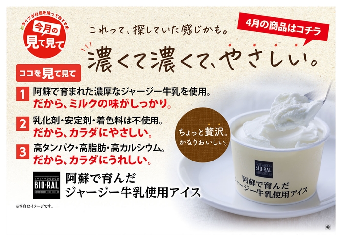 ライフが自信を持っておすすめする「今月の見て見て」の近畿圏4月商品に選ばれた「BIO-RAL 阿蘇で育んだジャージー牛乳使用アイス」は、乳化剤・安定剤・香料を使用せずに作った体に優しい味わいのアイスです。さっぱりとした自然な甘さは、本格的に暑くなる前の今の季節にぴったりです。