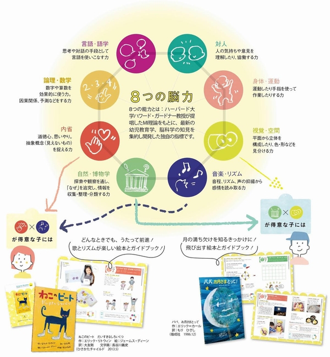 凸版印刷株式会社と早稲田大学 本田恵子教授が共同開発した、8つの脳力指標(※)に基づき、独自の観点から絵本を厳選。2歳から6歳までの子どもを養育する一般生活者が専用サイトにて子どもの思考パターンや行動パターンに関する質問項目脳科学に基づいた44問の質問に答え、8つの脳力指標で個性を診断。診断結果に基づき、得意な脳力を伸ばす絵本や新しい脳力を開拓する絵本などオススメの絵本4冊から1冊を選んで申し込みます。後日、選択した絵本1冊と絵本を遊びつくすためのオリジナルブックレットがセットで自宅に届きます。子どもの個性診断結果と、個性を生かした関わり方アドバイスによって、親子のかかわり方の視点を拡大。子育てや子どもの成長を支援します。