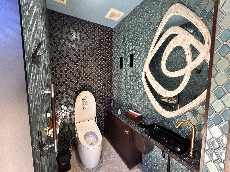 入り口はスライドドアになり、室内空間は大幅に拡大しました。鏡とお手洗いは、車いすユーザーが使いやすいように少し低めの位置にあります。デザインのイメージは“海”です。