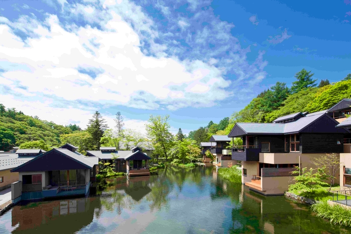 谷の集落に滞在する。離れの客室は水辺を囲み、部屋のテラスからは季節のうつろいが感じられます。軽井沢野鳥の森に面した豊かな自然環境にて、休息の時間を満喫できる滞在型リゾートです。