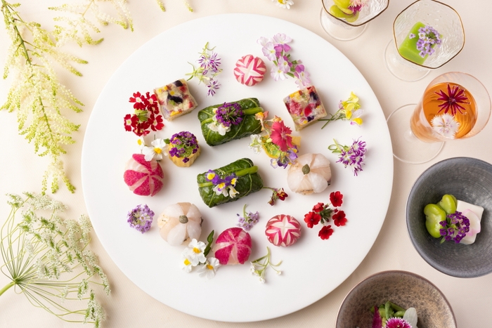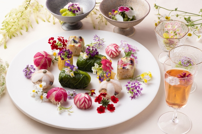 軽井沢の花をテーマにした朝食を提供します。例えば、コブシの花を使用した「花豆腐」。これは、軽井沢の町木であるコブシの花で香りづけした出汁と胡麻、葛(くず)を練り合わせてなめらかな口当たりに仕上げた豆腐です。手毬(てまり)寿司は、昆布締めにした鯛と濃いピンク色の紅芯大根を重ね合わせサクラソウに、香ばしく焼き上げた鰻を鋳(い)込んだ酢飯の上に酢漬け大根の薄切りと実山椒を添えてヤマボウシに見立てます。また、えんどう豆のすり流しや山菜のお浸し、焼き魚など、旬の食材を華やかに盛り付けた品々も提供します。まるで花が咲いているかのような演出に、自然と顔がほころび、心が晴れやかになります。