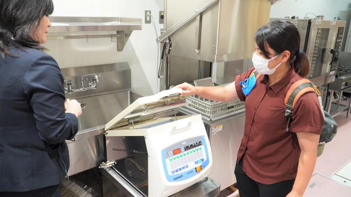 業務用厨房施設の見学では、HACCP(国際的な衛生管理の手法)に対応した機器や厨房施設、調理作業者の安全や負担軽減に配慮した調理器具や作業空間など、実物に触れて体験することができました。