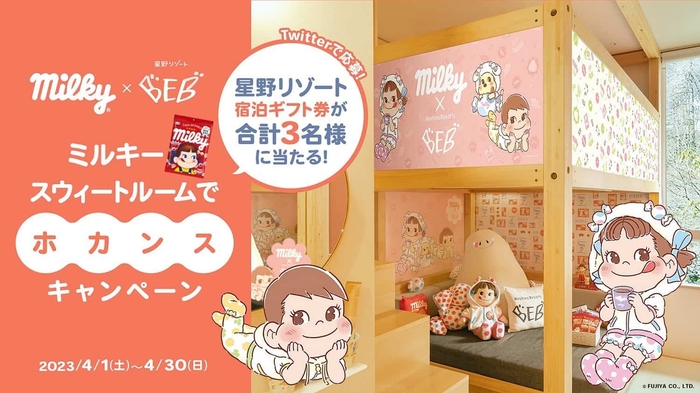 【BEB】不二家 × 星野リゾート BEB コラボキャンペーンを実施!~ミルキーをテーマにした、客室・スウィーツを楽しむ“ベブいホカンス”「ミルキースウィートルームステイ」販売|期間:2023年4月1日(土)~6月30日(金)