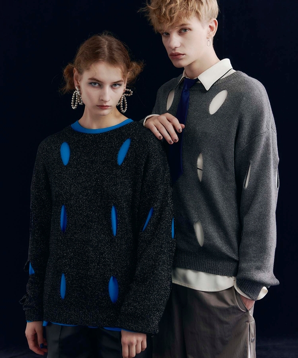 穴あきデザイン、ラメ糸の使用などトレンドを詰め込んだ一枚です。