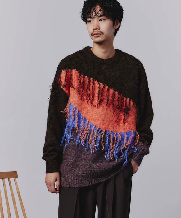 スーパービッグシルエットながらも袖口と裾リブをしっかりとしめることで丸みのあるシルエットに設定したニット。配色切り替え部分には手作業でフリンジ加工を施したこだわりの一枚。