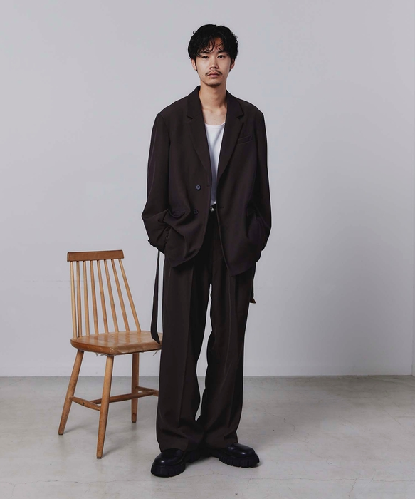 クラシックなセミダブルデザインをベースにした太めのラペルとボックスシルエットが特徴のジャケット。