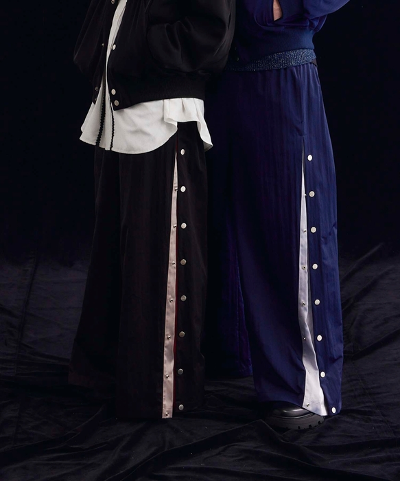 トレーニングパンツをデザインソースにしたワイドフレアパンツ。