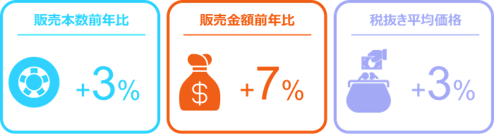 2025年1月の自動車用タイヤ販売は、本数前年比3%増と微増であった。店頭では同10%増であったことに対し、インターネットでは同6%減と前年を割り込んだ。降雪があったことで冬タイヤが本数前年比14%増と二桁成長となった一方で、夏タイヤは同3%減と微減であった。タイヤ全体の税抜き平均価格は11,409円と前年同月から3%上昇し、店頭では4%、インターネットでは3%上昇した。この結果、金額前年比はタイヤ全体で7%増となった。店頭では14%増と好調であったが、インターネットでは4%減にとどまった。