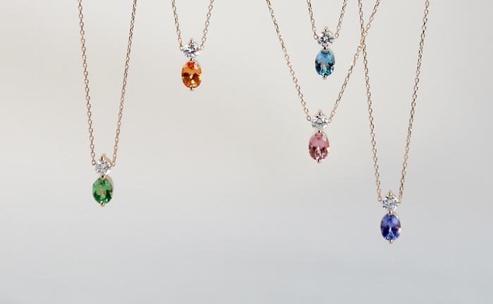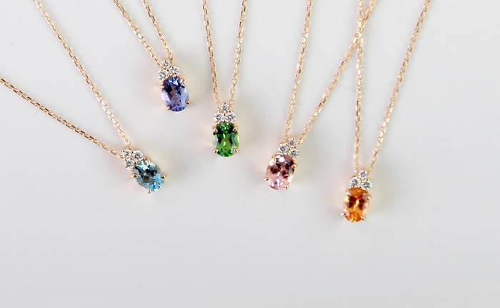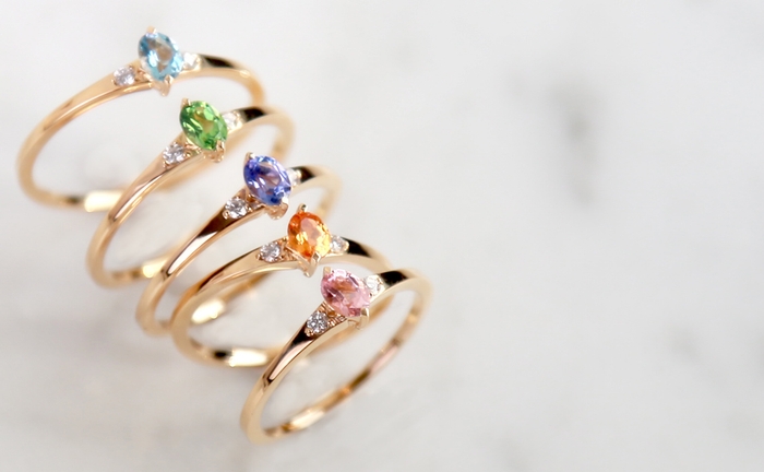 新商品は、リング3種類、ペンダント2種類の5つのデザイン。各デザインごと、タンザナイト・アクアマリン・ピンクトルマリン・マンダリンガーネット、グリーンガーネットでご用意しています。