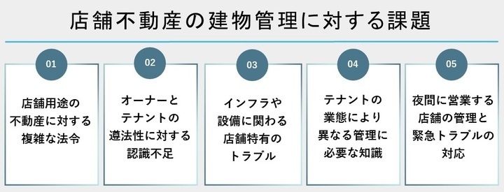 店舗不動産に特化した全国規模の建物管理会社は皆無に等しいといえます。その要因は、一般的な流通不動産であるオフィス、レジデンスと比較して、「店舗不動産」は不特定多数の来客を前提としているため、建築基準法や消防法では厳しい安全基準が定められており、複雑な法令、店舗特有のトラブルと専門性を要する対応、業態の多様化、用途変更の繰返しなど管理する難しさが上げられるためです。しかし、法令改正前に着工した建物は、テナントの内装工事や業態変更や増改築によって、現状の基準法には沿わなくなっている店舗不動産はめずらしくなく、本来、このような店舗ビルは、共用部はもちろん、賃貸区分も含めた建物全体を関係法規、条例に適合した状態に是正しなければなりません。
