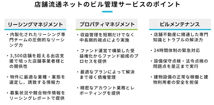 店舗流通ネット株式会社(東京都港区:代表取締役社長 戸所岳大)は、2021年4月26日(月)より店舗に特化したビル管理サービスを開始します。当サービスは、店舗不動産を所有する不動産オーナーが通常行うさまざまな管理業務を一括して受託することで管理業務だけでなく、法令に基づいた是正を行うことで資産価値の向上を目的としています。年間20棟の管理受託を目標に関東から大阪、名古屋を中心とした全国への提供を目指します。