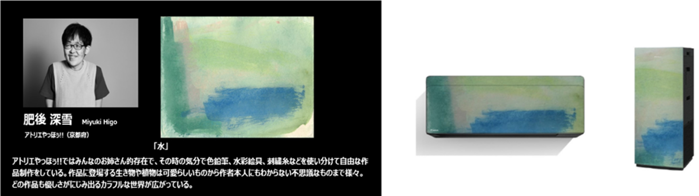 今回、「ART」では“異彩を、放て。”をミッションに、障害のイメージ変容と新たな文化の創出をめざすクリエイティブカンパニーの株式会社 ヘラルボニー(以下、ヘラルボニー)とコラボレーションしました。ヘラルボニーが掲げる“障害のイメージ変容を目指す”というビジョンとダイキンの『The Art Line』に込めた、家電のイメージを変え、“アートを選ぶようにエアコンを選ぶ新たな考え方を創っていきたい”との想いが合致し、ヘラルボニーがライセンス契約を結んでいる4名の異彩を放つアーティストの作品を採用しました。