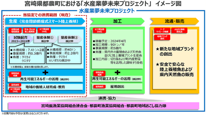宮崎県都農町で、岡山理科大学と同町、NTT東日本・西日本が連携して進めている好適環境水®によるハタ科の「タマカイ」と交雑種「クエタマ」の陸上養殖がスタートして10カ月余が経過した2月13日、プロジェクトの中間成果報告会が同町役場で開かれました。完全閉鎖循環式陸上養殖で両魚種の養殖が成功したのは「世界初」とし、今後は特に高い生残率(約94.2%)と、海面養殖に比べて成長速度約3倍という高成長率が確認できたタマカイに絞って、量産化・ビジネス化に取り組んでいく方針が示されました。