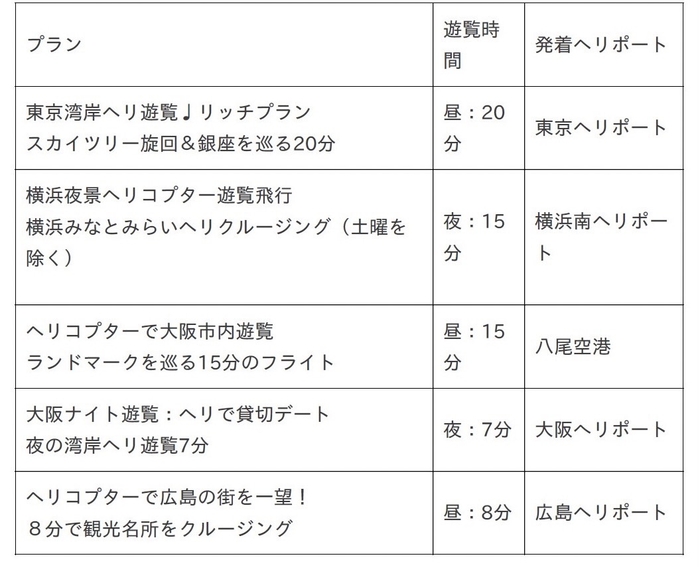 ※上記プランは、2023年5⽉1⽇現在選択可能のプランになります。提供内容及びヘリポート場所の変更が発⽣する可能性がございますので、予めご了承ください。