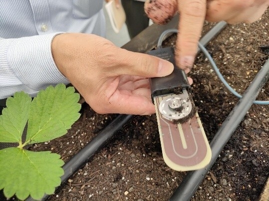 両社は展示会での接点をきっかけに情報交換を重ね、デンソーが開発を進める水ポテンシャル(pF)を測定できる土壌センサーを、当社が所有する岐阜県可児市の研究用ビニールハウスに導入して検証を行うこととなりました。