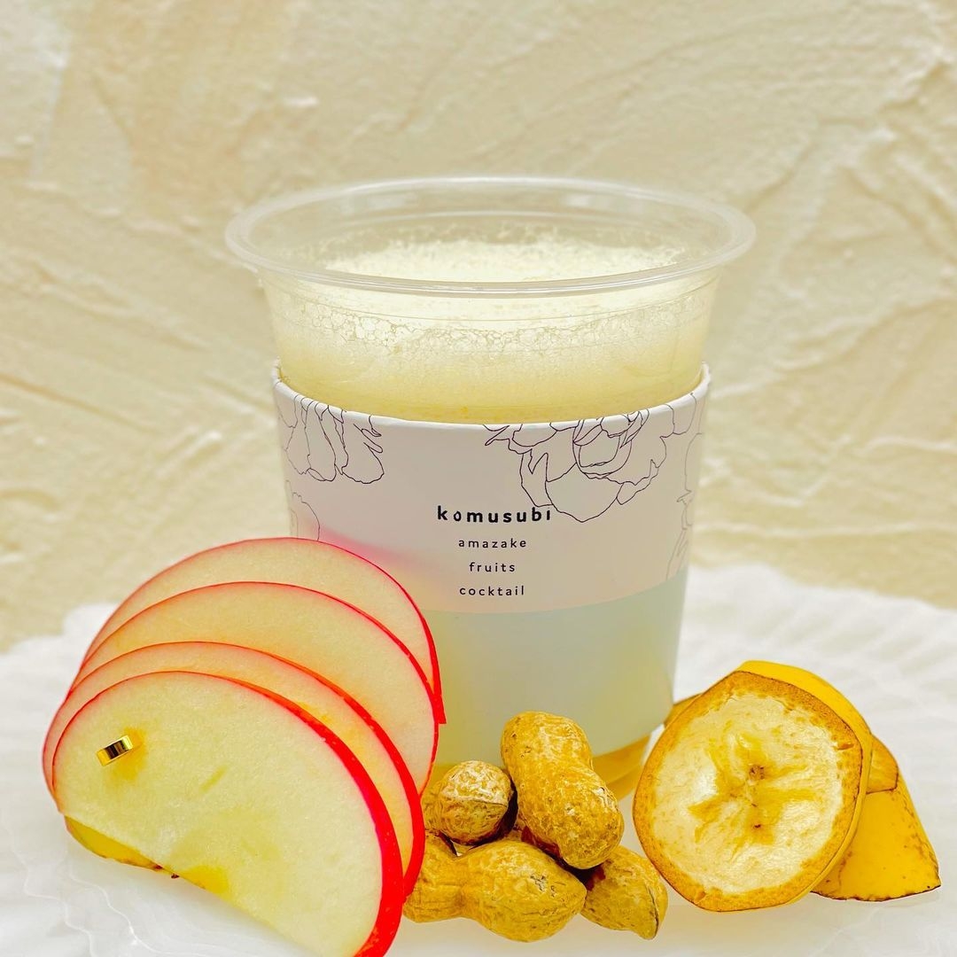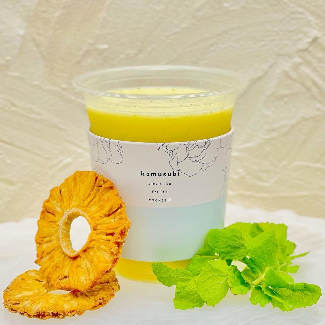 甘酒スタンドkomusubiは、『カクテルコンペ日本大会ファイナリストバーテンダーが、美容と健康を考えて作った、フルーツと甘酒を使ったヴィーガン ノンアルコールカクテル』専門店です。砂糖や乳製品不使用のヴィーガン対応なので、お子様を始め幅広い層の方々に安心して呑んでいただくためのレシピを心がけた自信作です。もし苦手で飲めなかった場合には全額返金致します。