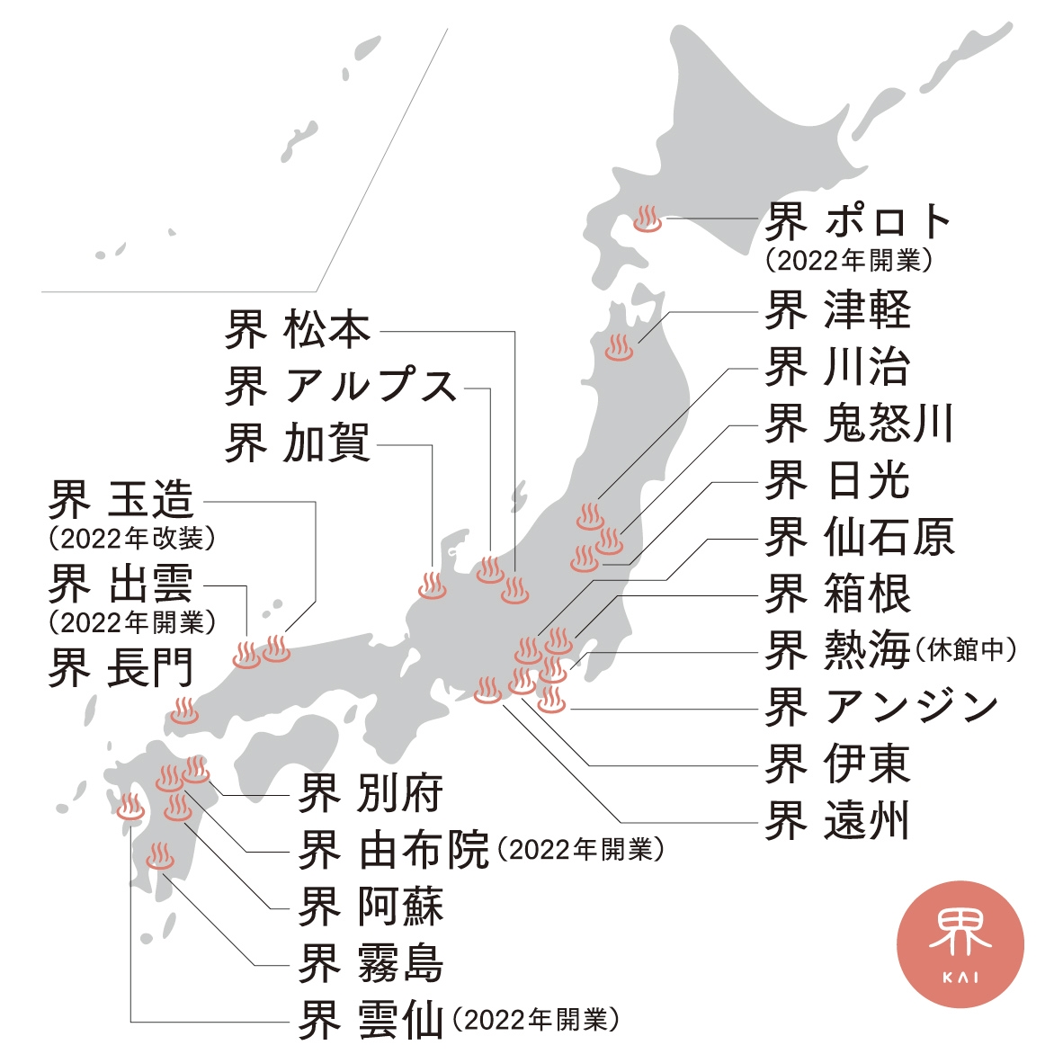 「界」は星野リゾートが全国に展開する温泉旅館ブランドです。「王道なのに、あたらしい。」をテーマに、季節の移ろいや和の趣、伝統を生かしながら現代のニーズに合わせたおもてなしを追求しています。また、その地域の伝統文化や工芸を体験する「ご当地楽(とうちがく)」や、地域の文化に触れる客室「ご当地部屋」が特徴です。現在、全国各地に展開しており、2022年11月には、「界 玉造」が島根県・玉造温泉にて改装をへて再開業、「界 出雲」が同県・出雲ひのみさき温泉に、「界 雲仙」が長崎県・雲仙温泉に新規開業しました。