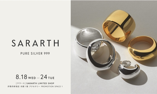 ジュエリーブランド「SARARTH(サラース)」は、ブランド初となるポップアップストア「SARARTH LIMITED SHOP」を、伊勢丹新宿店 本館1階 PROMOTION SPACE 1にて8月18日(水)~8月24日(火)の7日間の期間限定で出店いたします。今回、高硬度PURE SILVER 999/24金(K24)プレーティングの2色で展開する各アイテムに加え、新コレクション「SUBLIME」も初公開となります。 「素材本来の無垢な美しさ」と「金属アレルギーへの配慮」を両立した世界初の新素材・高硬度PURE SILVER 999を用い、「PURE SILVER FOR SKIN, PURE LIGHT FOR ALL. 肌によりそう光 高硬度ピュアシルバー」をフィロソフィーに掲げる「SARARTH」。2021年4月の発売以来、シルバー本来の美しさを引き立てる、ミニマルでジェンダーレスなデザインを表現してきました。