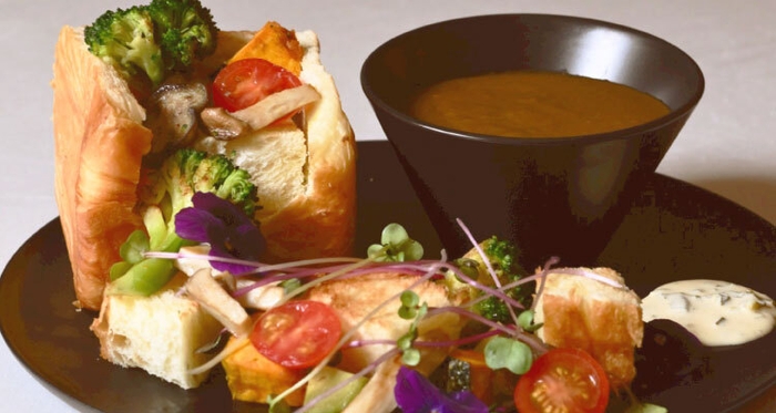 香り立つスパイスカレーにボリュームたっぷりでサクサクのデニッシュを合わせた、食べごたえ満点の一皿。彩り豊かな野菜が華やかさを添える、目にも美味しい華やかランチプレートです。甘酸っぱいディップで味変も。デニッシュは贅沢に3分の1本を使用しており、ご家族やお友だちとシェアしていただくのもおすすめです。デニッシュは追加もOK(無料)。