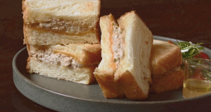 旨み豊かなツナ、シャキッとした玉ねぎ、酸味のきいたコルニッションをマヨネーズで上品に和えたフィリングを、デニッシュにたっぷりと挟みました。とろけるチェダーチーズとの相性は抜群です。黒七味でピリッと仕上げた大人のためのスパイシーなサンドイッチ。京都ならではの味わいの一品です。