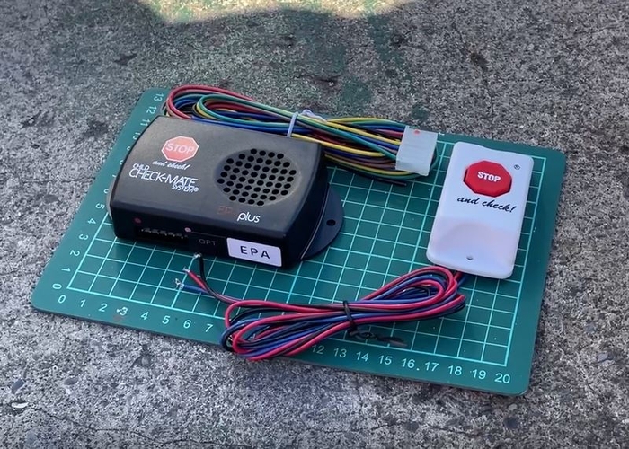 車両への子どもの置き去り防止の安全装置として「チャイルドチェックメイト」という製品を使用しました。車両に取り付け、運転終了後エンジンを止めた際に警報の初期アラームが鳴りはじめ、運転席から後部座席へ各座席をチェックしながら後部座席まで行き、座席最後部に取り付けてある「押しボタン」を押すことで警報が鳴り止むという仕組みの装置です。