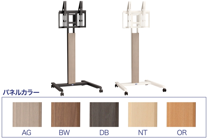 ディスプレイスタンドの本体カラーは黒色と白色の2色からお選びいただけます。木目調のデザインパネルはアッシュグレー(AG)、ブラウン(BW)、ダークブラウン(DB)、ナチュラル(NT)、オレンジ(OR)の5色をご用意しています。