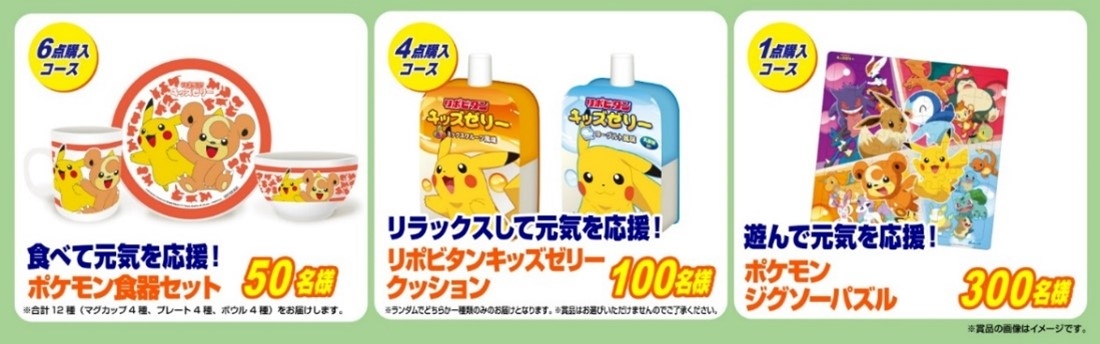 ■応募方法:キャンペーン期間中に対象品(リポビタンキッズゼリー各種)を購入されたレシートを専用サイトにて登録またはハガキに添付して応募していただくことで、ポケモングッズが抽選で当たります。