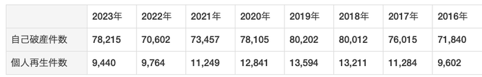 上の表は、全国の自己破産、個人再生の件数の推移を表しています。なお、秋田県の最新2023年の自己破産の新規件数は515件でした。