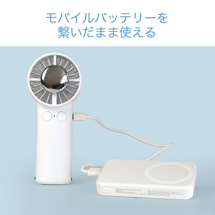 また、4,000mAhの大容量バッテリーを搭載しているため、一日中(最大13時間)使えてバッテリーの残量を気にすることなく涼むことができます。万が一、バッテリー残量が少なくなった時には、モバイルバッテリーに繋ぐことでそのまま使えます。