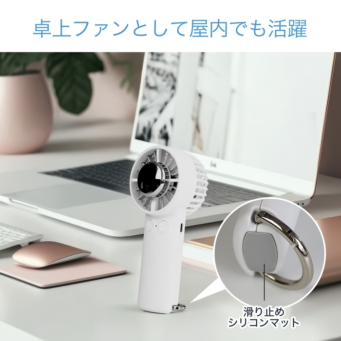 その他、カラビナフックが付いているため、バッグに付けて携行したり、フック部分を倒すことでオフィスや自宅でも卓上ファンとして使用できます。