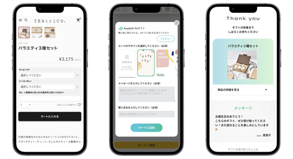 今回、当社のAnyGiftの提供により、ちょっとしたご褒美で幸せなティータイムに誘う「TEAtriCO オンラインストア」(URL: https://teatrico.jp/ )の商品がeギフトとして贈れるようになります。