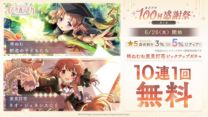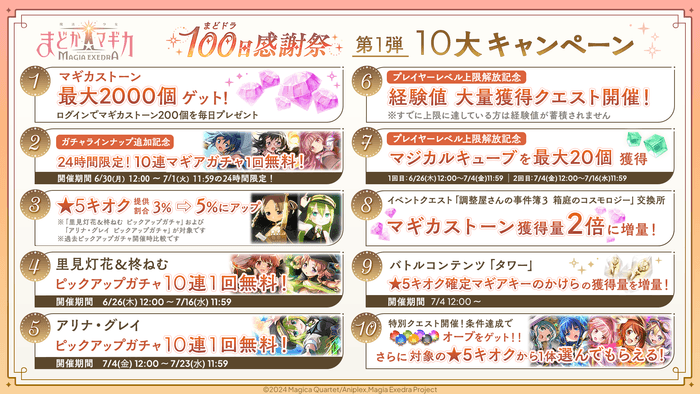 「魔法少女まどか☆マギカ Magia Exedra」はまもなくリリース100日を迎えます。リリース100日を記念して、6月26日(木)12:00より、100日感謝祭 第1弾 10大キャンペーンを開始いたしました。