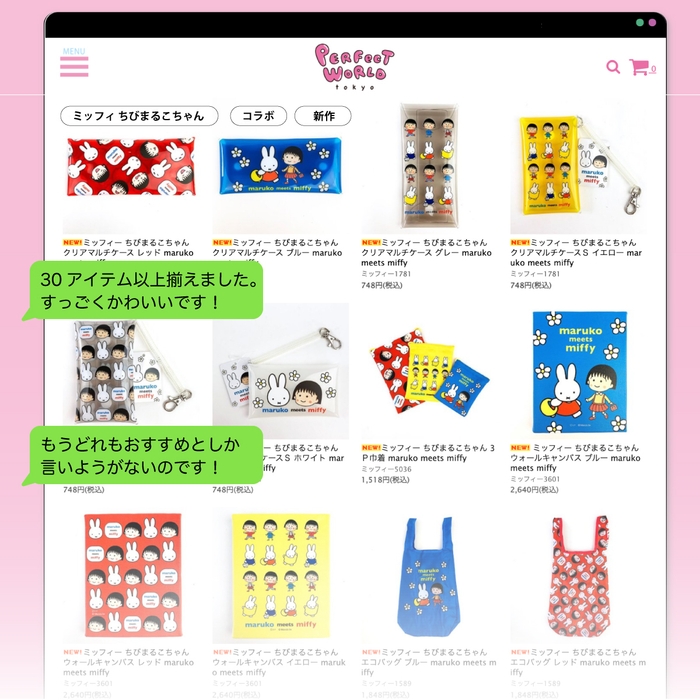 パーフェクトワールドトーキョーは、アニメやキャラクターグッズを10,000点以上扱う国内最大級のキャラクターオンラインストアです。スヌーピー、ミッフィなどの生活雑貨からポケモン、コナンといったアニメグッズまで10,000点以上を広く取り扱っております。時折企画される数量限定アイテムやコラボアイテムを楽しんでください。最新ニュースはSNSからどうぞ。キャラクター文化のあるここトーキョーから世界へ、情報やグッズを元気にお届けしてまいります♫