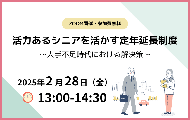 みらいコンサルティンググループ(本社:東京都中央区、代表:久保 光雄 岡田 烈司)は、2025年2月28日にセミナー『活力あるシニアを活かす定年延長制度 ~人手不足時代における解決策~』をWEBにて開催します。