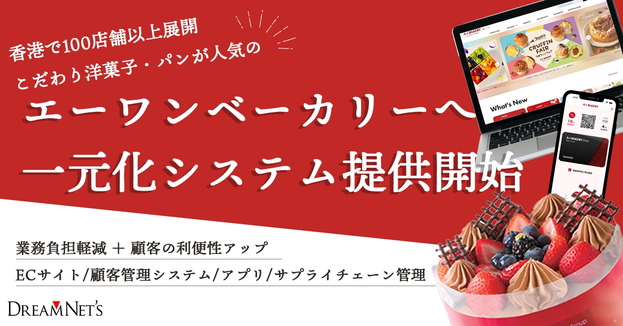 Webシステム開発会社である株式会社ドリームネッツ(本社:広島県福山市、代表取締役社長:井上 一成)は、香港を中心に100店舗以上を展開、こだわりの洋菓子・パンを製造・販売しているA-1 BAKERY CO.,(HK) LTD. (本社:香港、代表取締役社長:楊井 元伸)のWeb+店舗の受発注統合システムを開発。