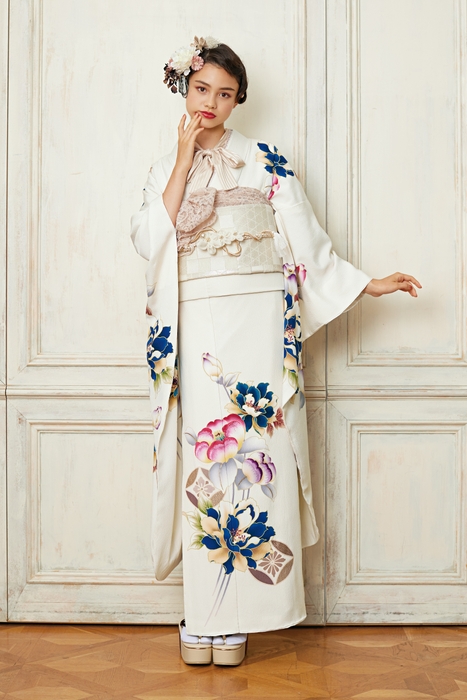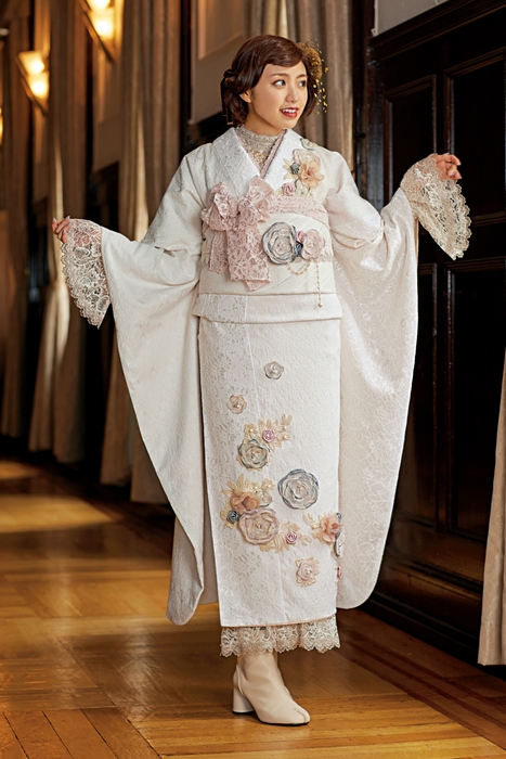 立体的な花モチーフをあしらった、クラフト感のある着物でフレンチシネマの主役のような、"大人かわいい" を手に入れて。