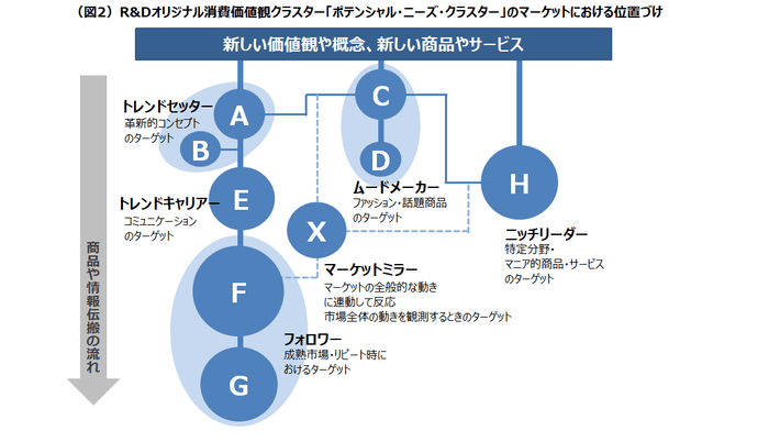 株式会社リサーチ・アンド・ディベロプメント(所在地:東京都新宿区、代表取締役:松田 武久)は、全国の20~39歳男女を対象に、新型コロナウイルス流行下における生活の変化と今後の意識について調査を行い、独自の生活価値観クラスター「ポテンシャル・ニーズ・クラスター」(図1、2)により、新型コロナ禍での価値観の違いによる意識や行動の差異を分析しました。