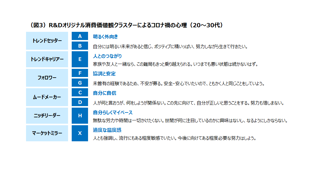 新型コロナウイルスという未曽有の緊急事態に直面したときに、人々の意識や行動は、生活欲求の方向性を平常時よりもさらに色濃く反映し、そのためにクラスターごとの差異が顕著に表れていました。