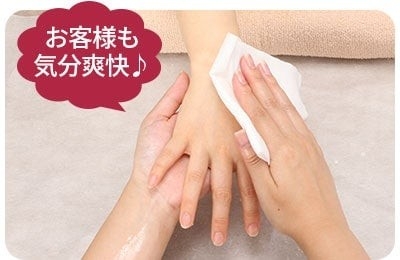 施術後は、タオルで拭き取るだけでスッキリ!お客様の着替えがある場合でも、服にベタついたりすることがなく、快適に着脱していただけます。