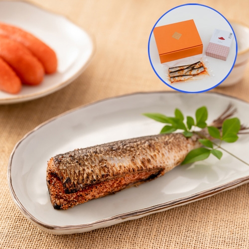 ノルウェー産のサバをやますえ特製の辛子だれにじっくり漬け込み、切れ目を入れて明太子を挟みました。