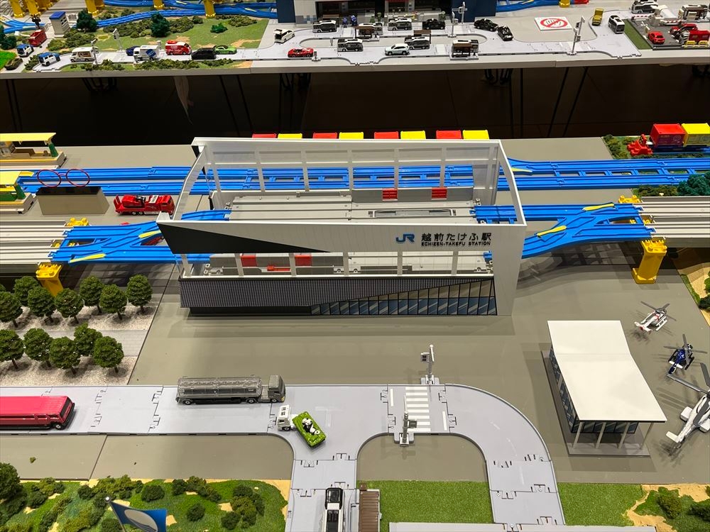 2.新九頭竜橋等の情景をモチーフにし、JR 福井駅・JR 敦賀駅などをプラレールの世界で再現した巨大なジオラマを展示
