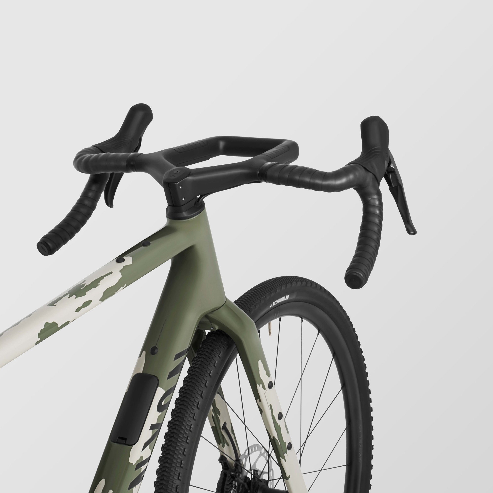 SRAM XPLRまたはShimano GRXを採用し、ワイドなギアレンジとスムーズなシフトフィールを両立。無駄なギア飛びもなし。