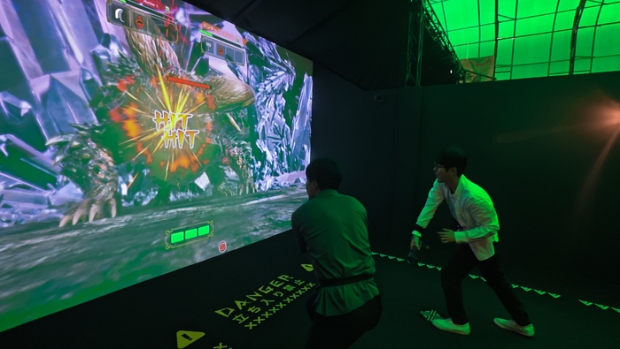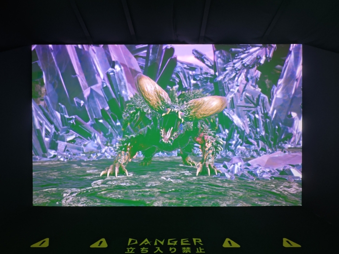 本アトラクションでは、参加者は「アワジ集会所」に訪れた新米ハンターとなって、腕利きのハンターになるための訓練クエストに挑戦することができます。訓練クエストは「フィールド探索」と「大型モンスター討伐」の二部構成。参加者は、討伐エリアの中で、アクションコントローラーとトラッキング端末を身に付けた状態で画面上の大型モンスターと対峙し、全身を使って武器を操り、攻撃を回避しながら討伐成功を目指します。自分専用の認証ICタグ「ハンターの証」を使い討伐を重ねることで「ハンターランク」が上昇し、次回以降の討伐にデータを引き継ぐことが可能となっています。