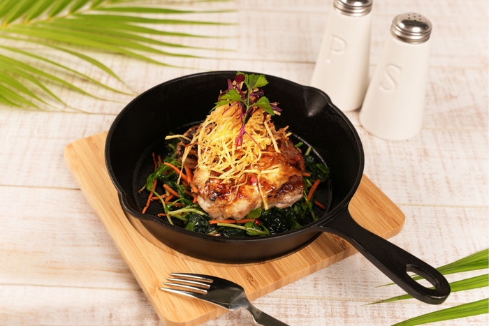 沖縄で大人気!沖縄県北部・やんばる産ハーブ鶏に沖縄伝統の油味噌“あんだんすー”を合わせてグリル。パリパリ食感のガルニチュールとともに熱々鉄板でお楽しみください。
