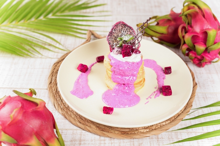 沖縄の南国果実”ドラゴンフルーツ”を使ったソースがたっぷりかかった、見た目も華やかなふわふわパンケーキ。ドラゴンフルーツは食物繊維が豊富で美容や健康にも良いとされています。