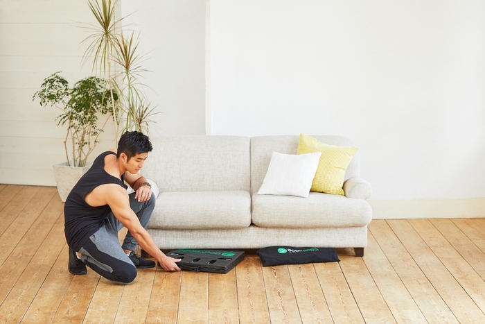 「BODYBOSS」は新型コロナウイルスの影響により大きく伸びたフィットネス器具の一つです。2019年4月、5月の販売数が平均100台程度だったのに対し昨年2020年緊急事態宣言時の4月、5月は2,000台と同期比20倍の販売実績となりました。2021年、2回目の緊急事態宣言以降も順調に推移し、今年の4月には1万台を突破する勢いです。2018年販売当初から自宅でトレーニングすることを推進してきた器具「BODYBOSS」は、政府が掲げる3密対策によって、フィットネススタジオやジムの利用時間の分散や短縮なども重なり、フィットネス不足を補う上でも自宅でトレーニングする、“宅トレ”の需要としても注目されてきました。「BODYBOSS」のサイズは、土台を畳んだ状態で幅40センチ、奥行50センチ程度、高さも7センチとコンパクトになるため、机やテーブルの隙間などに収納できるのもメリットです。使用時は、幅が81センチになる程度となるため、ワンルームやスペースが少ない自宅の環境にフィットしたトレーニング器具です。
