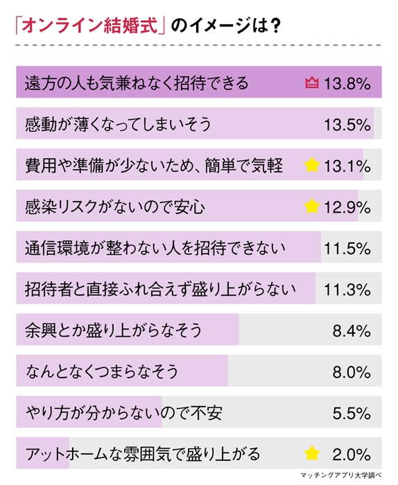 “オンライン結婚式”のイメージで一番多かった回答は、「遠方の人も気兼ねなく招待できる」(13.8%)でした。他にも「費用や準備が少ないため、簡単で気軽」(13.1%)や「感染リスクがないので安心して実施できる」(12.9%)といった肯定的な意見がありました。