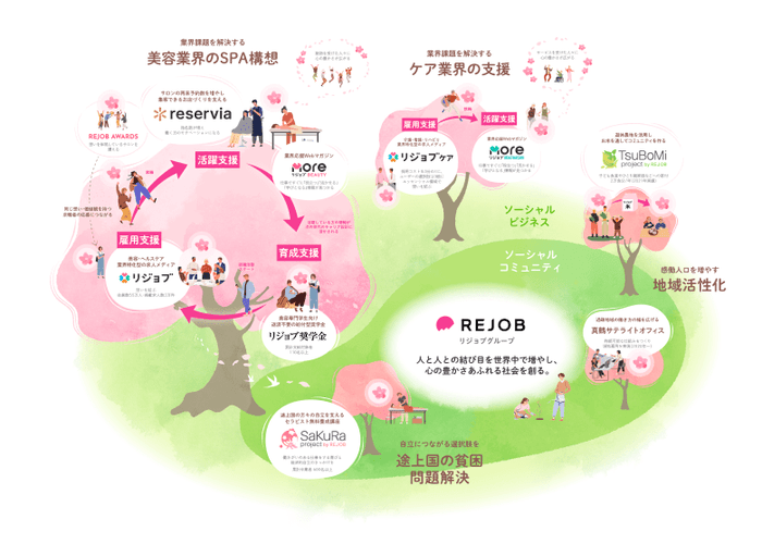 創業10周年を機に、ソーシャルビジョンを 「人と人との結び目を世界中で増やし 心の豊かさあふれる社会を創る」へ刷新。IT化が進み簡単に人と人とが繋がれる時代だからこそ、その繋がりを良いご縁・温もりある結び目へと昇華したいという想いを込めています。2020年には新ビジョンを体現すべく、自治体とともに地方を創生する 「真鶴サテライトオフィス」を立ち上げたほか、サービスのプロダクトビジョンを「想いを結ぶ」と定めました。また、 おもてなし業界における「育成支援」「雇用支援」の次の「活躍支援」をより強化すべく、新たにリジョブグループとなった株式会社リザービアによる、「集客できるお店づくり」を支えるサロンの自社集客システム事業を展開しています。
