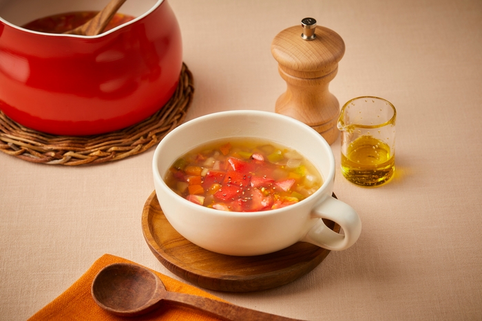 (レトルト「柚子香る野菜スープ」+トマトでヘルシーに満足感アップ♪)
