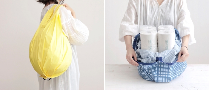 2018年10月に発売したタテ型「Shupatto コンパクトバッグ Drop」は、しずく形状で荷物を入れてもスリムに持ち運べる点や、たたむとフラットに薄くまとまり携帯しやすい点がご好評をいただいております。